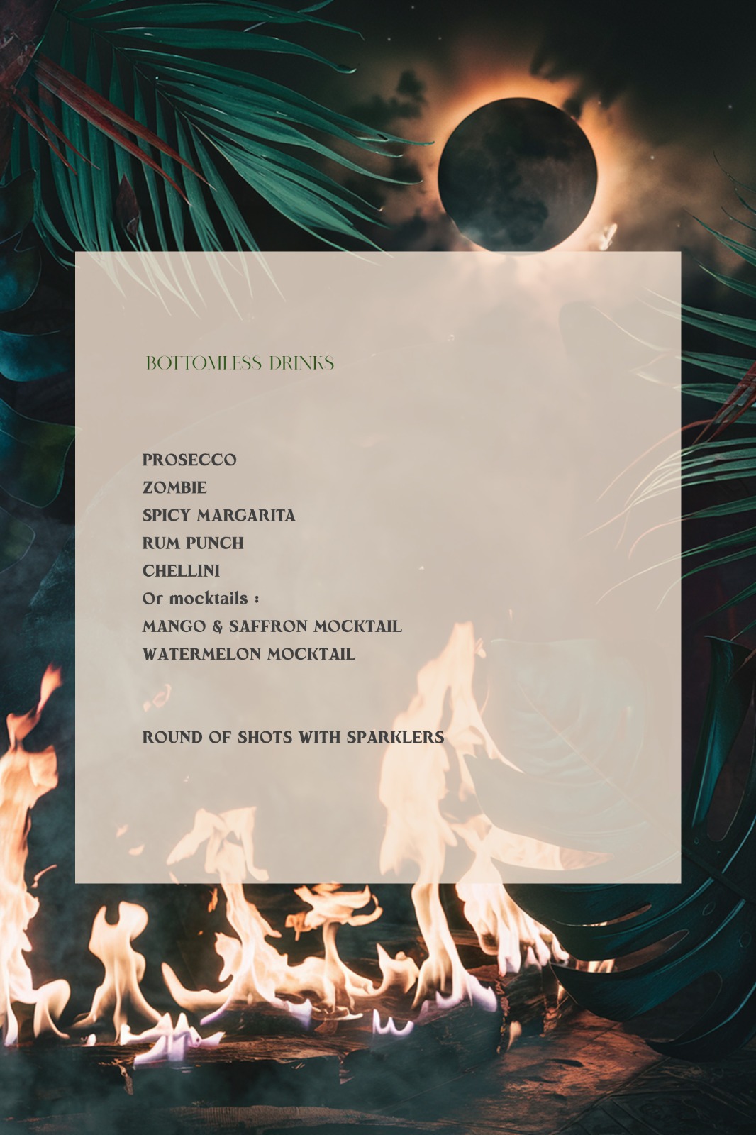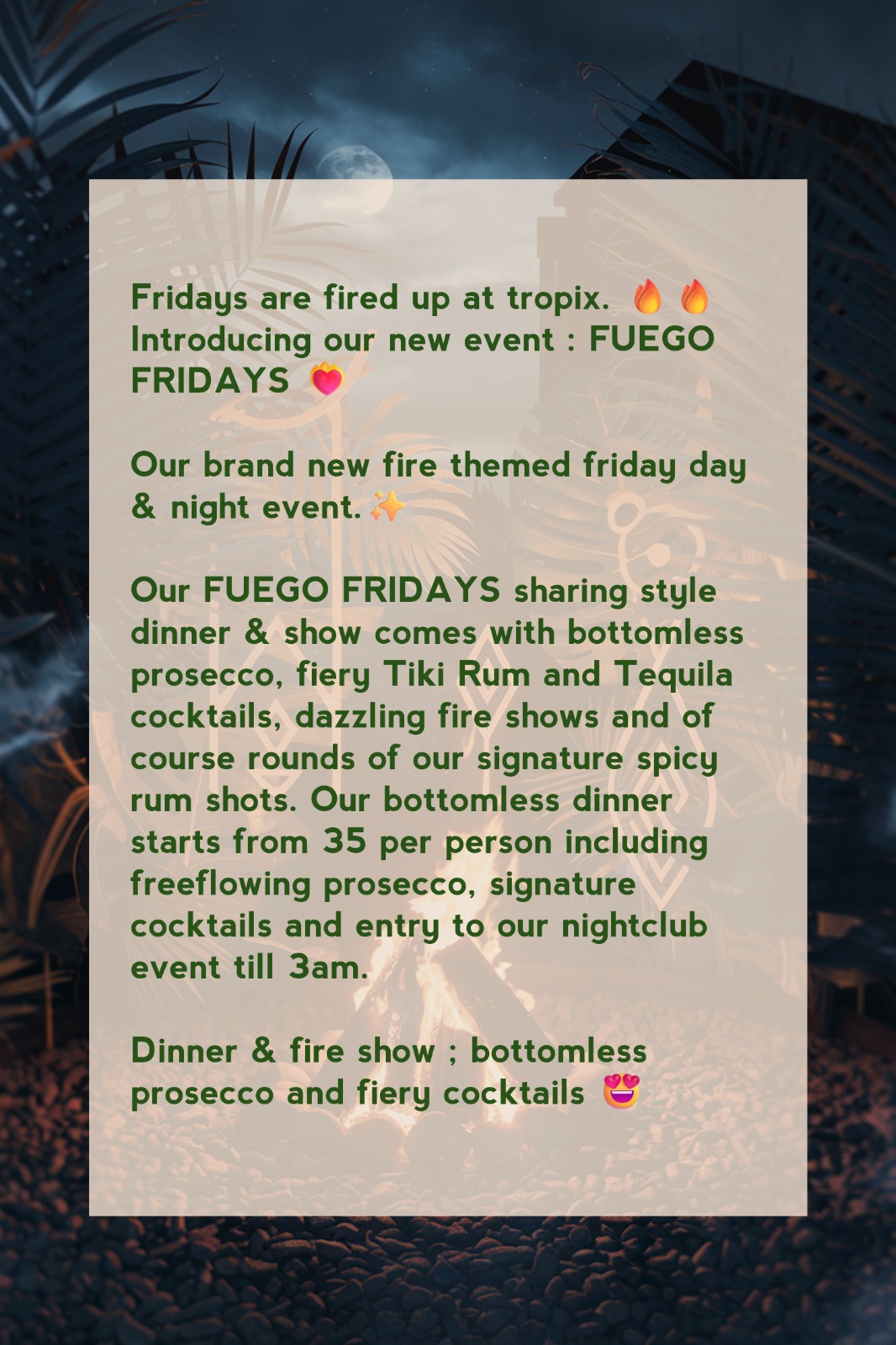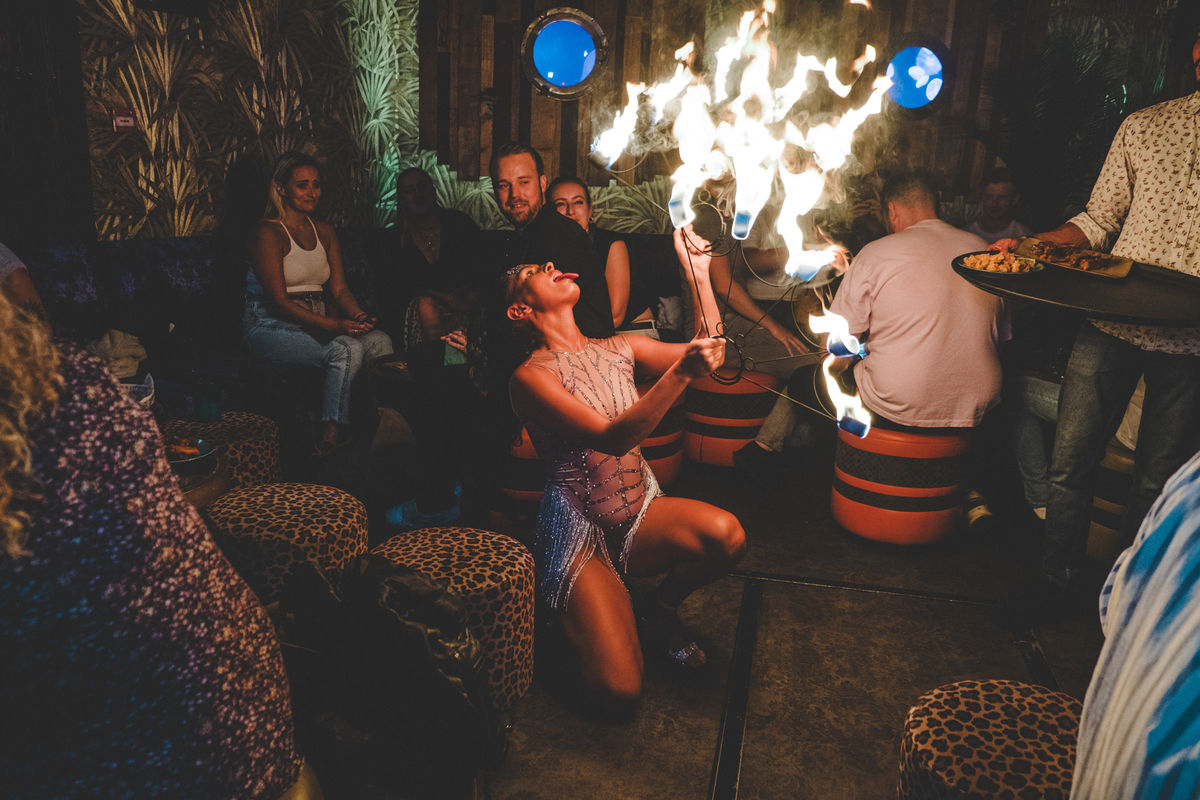 Our FUEGO FRIDAYS sharing style dinner & show comes with bottomless prosecco, fiery Tiki Rum and Tequila cocktails, dazzling fire shows and of course rounds of our signature spicy rum shots. Our bottomless dinner starts from 45 per person including freeflowing prosecco, signature cocktails and entry to our nightclub event till 3am.